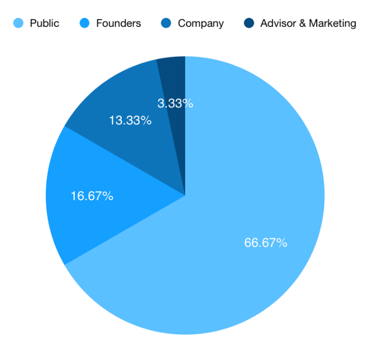 Public-token-sale distribution breakdown: 66.67% for public sales; 16.67% for founders; 13.33% for company and employees; 3.33% for advisors and token-sale marketing costs.