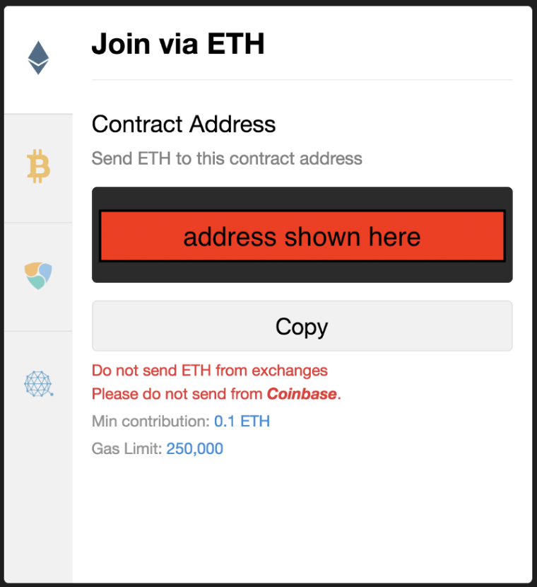- There is only ONE address for each cryptocurrency purchase, we now accept ETH, BTC, NEM and QTUM.