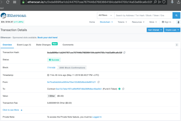 https://etherscan.io/tx/0xda889fbe1cb2447f07cee767f446d7683664184cdaf44700c14a53a69ca6c02f