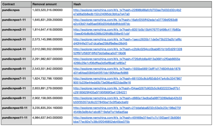 The total amount of NPXSXEM consists of the supply from 12 contracts. Here is the list of the removal taken place in their relevant contract addresses.