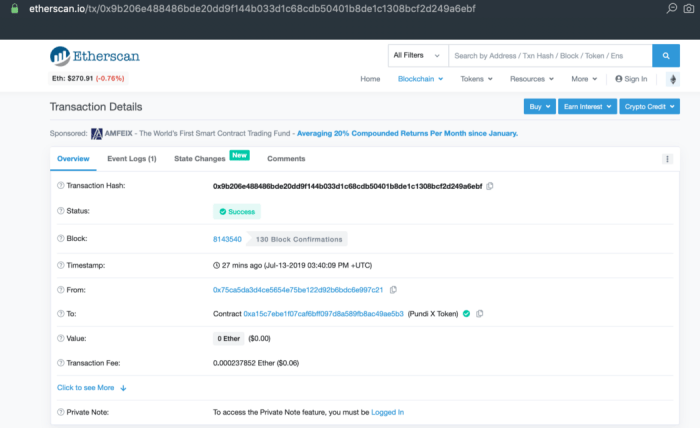 https://etherscan.io/tx/0x9b206e488486bde20dd9f144b033d1c68cdb50401b8de1c1308bcf2d249a6ebf