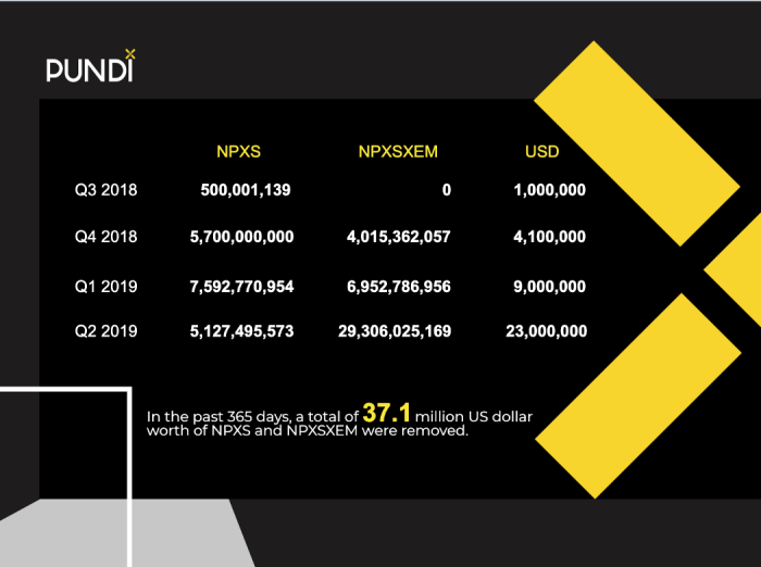 It’s equivalent to 23 million US dollars worth of value as of July 14, 2019. After the Q2 removal, the total supply of NPXS is now 261,834,927,333 and the total supply NPXSXEM is 67,725,825,820.
