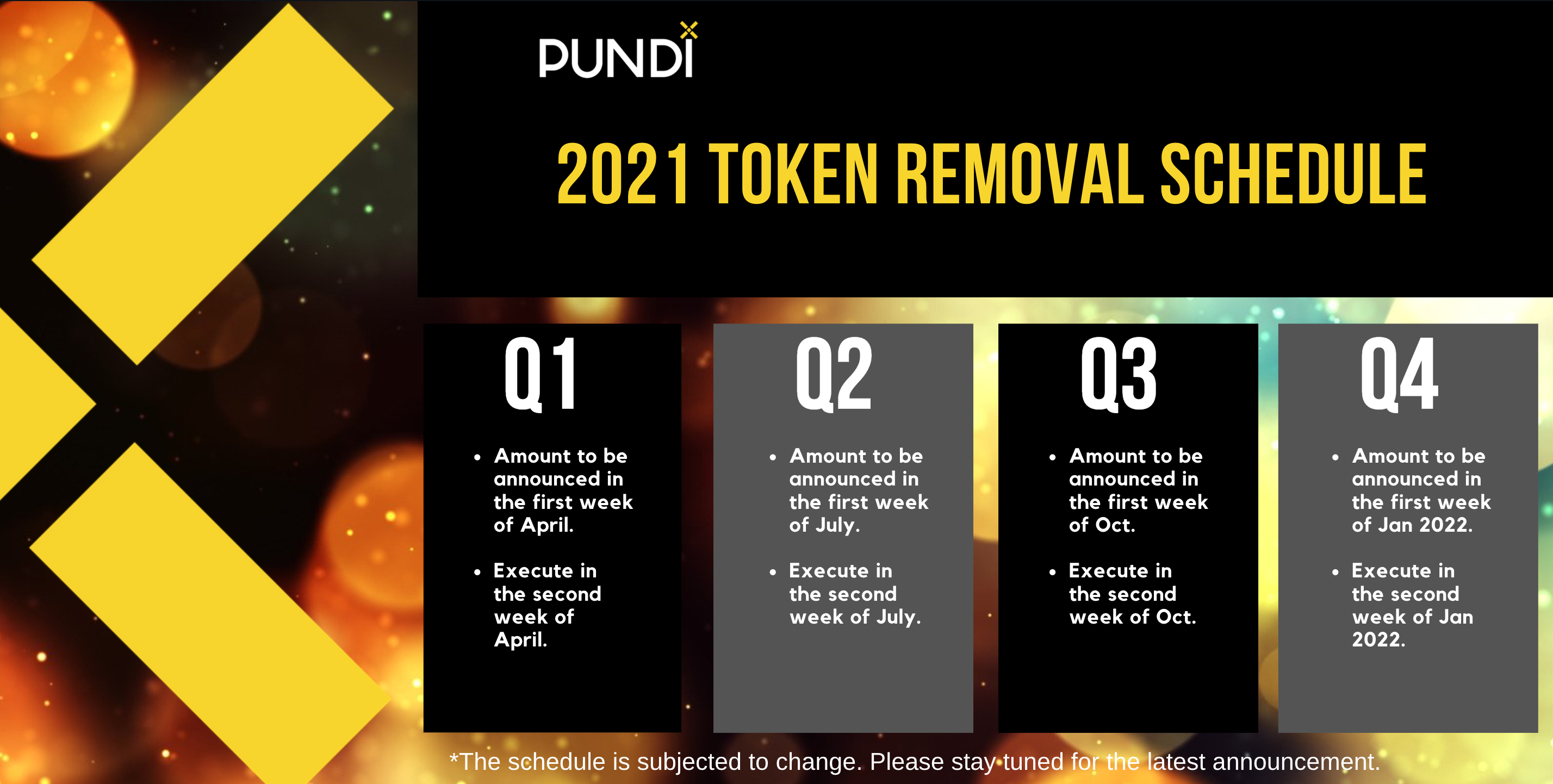 Pundi X founders have done token buyback back in 2018 and 2019 for five times totaling to 1400 ETH and I personally did three more buybacks in 2021 after NPXS hitting certain price target. 2021’s next buyback will take place once NPXS hits $0.005 price target. The buyback token is an unscheduled event to decrease token circulating supply in the market and I am still committed to buyback more from the open market, from time to time.