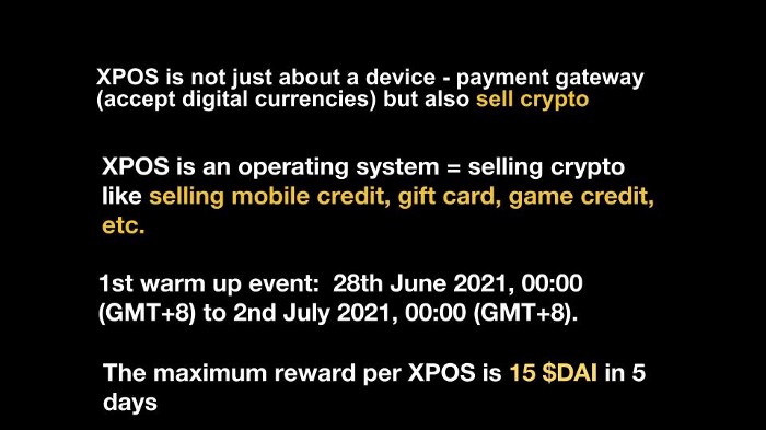 We have conducted a small scale of XPOS mining trail in late June. The purpose of the XPOS transaction mining is to make XPOS not only for payment but also selling other blockchain-based assets, which could be mobile credits, gift cards or game credits. This mining program is to motivate and reward XPOS merchants.