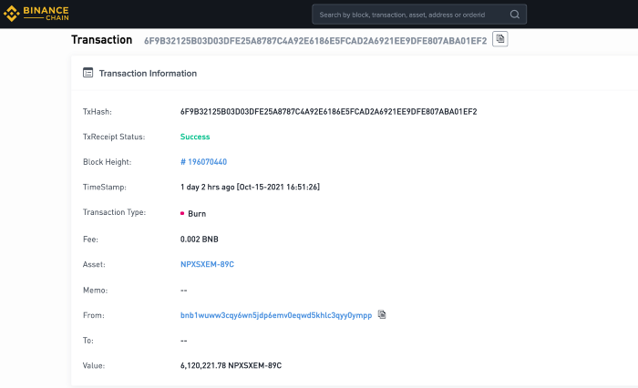$NPXSXEM Q3 2021 removal transaction: https://explorer.binance.org/tx/6F9B32125B03D03DFE25A8787C4A92E6186E5FCAD2A6921EE9DFE807ABA01EF2