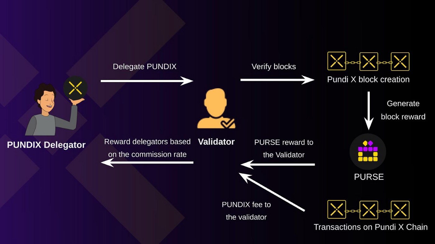 When delegating to Pundi X Chain, delegators are helping to verify the blocks. Every time a transaction happens, the delegators are helping to secure the transaction. The block rewards generated from block creations are PURSE tokens and are given to the delegators.