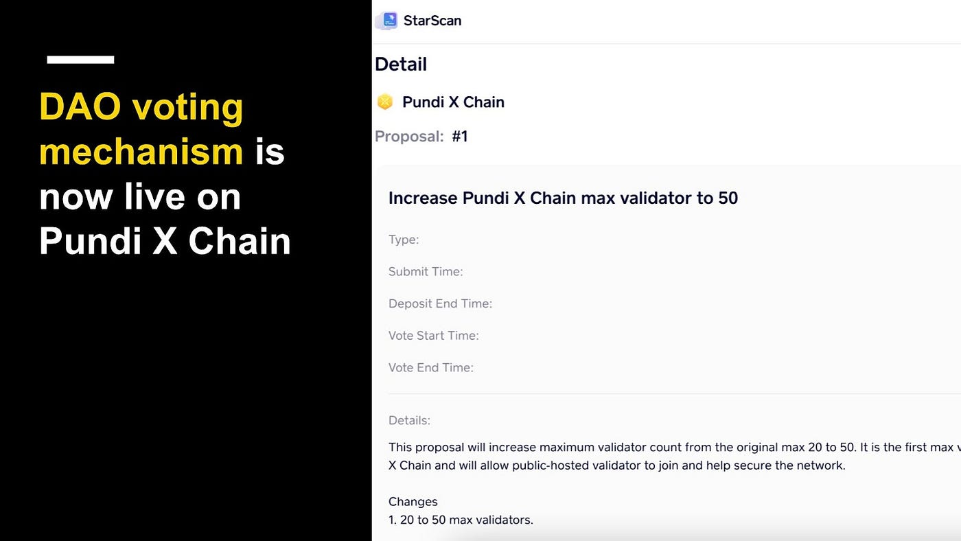 The Pundi X Chain Validators run full nodes and participate in consensus by broadcasting votes that contain cryptographic signatures. The community has already participated in securing validators, and the DAO voting mechanism is now live on the Pundi X Chain. Validators will be able to vote on behalf of those who delegated their PUNDIX tokens to them, and the controlling power of Pundi X Chain is now in the hands of the community.