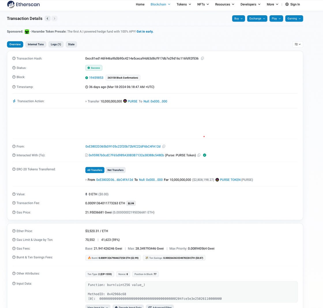 On Mar 18 2024, additional 10,000,000,000 PURSE tokens has been removed from the total supply due to the result of governance proposal to support ERC404 upgrade.