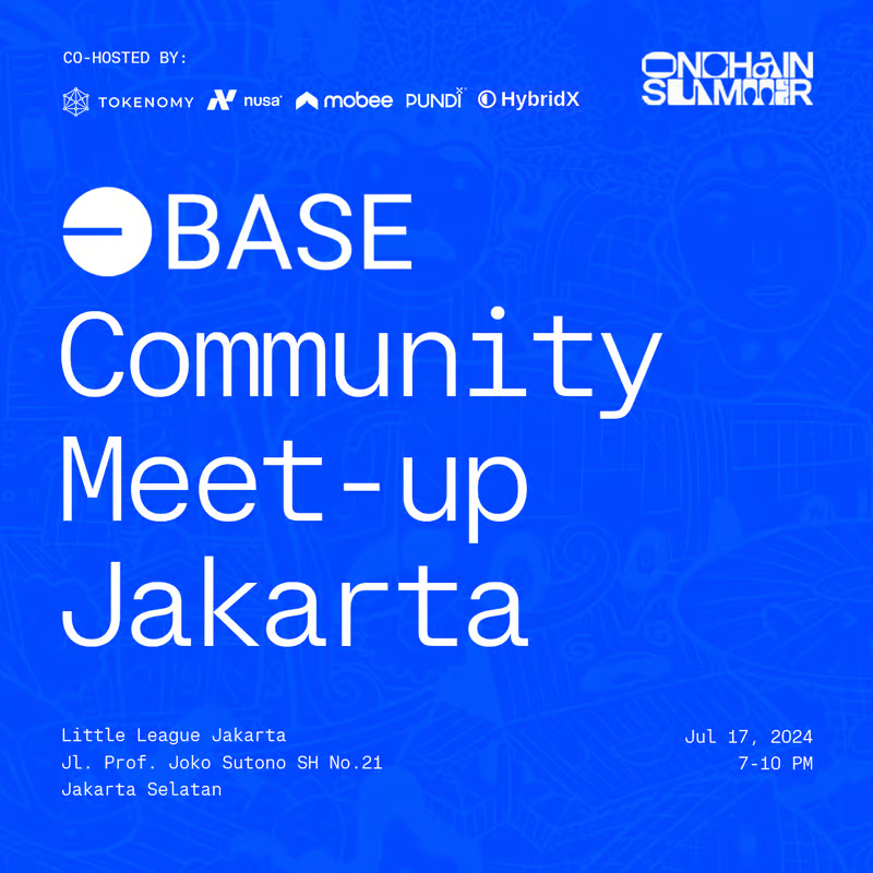 We’re kicking things off in Jakarta on July 17, 2024, alongside Base Indonesia contributors Tokenomy, Nusa, Mobee, and HybridX. Expect lively discussions and a chance to dive deep into the latest Web3 trends.